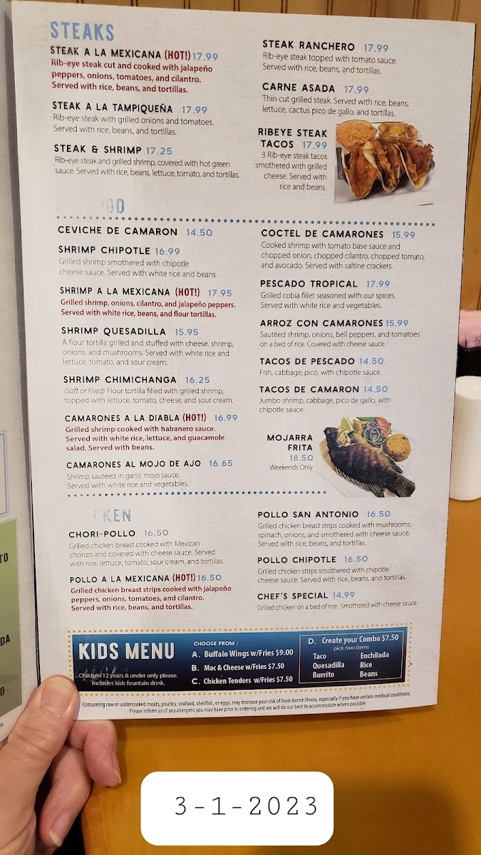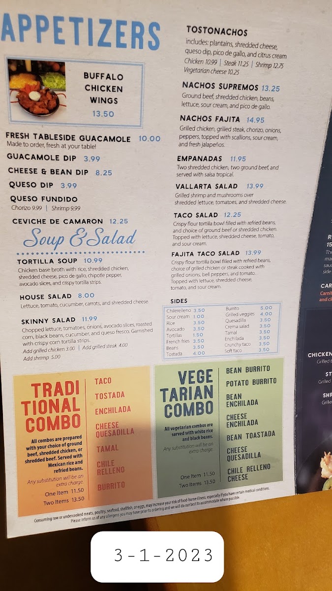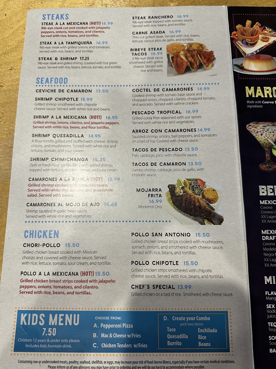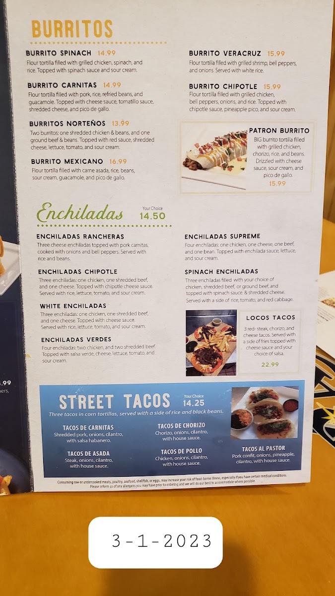 Guests can enjoy flavorful street tacos filled with options like steak, pork carnitas, or fish, alongside heartier plates such as chicken enchiladas or the steak burrito. Fresh table-side guacamole and chips with salsa make for great starters, while specialties like the shrimp chimichanga and chile relleno with beef tostada present more substantial choices. The menu pairs well with a variety of drinks, including classic margaritas and distinctive options like the jalapeno or peach margarita, which complement the friendly, festive setting.